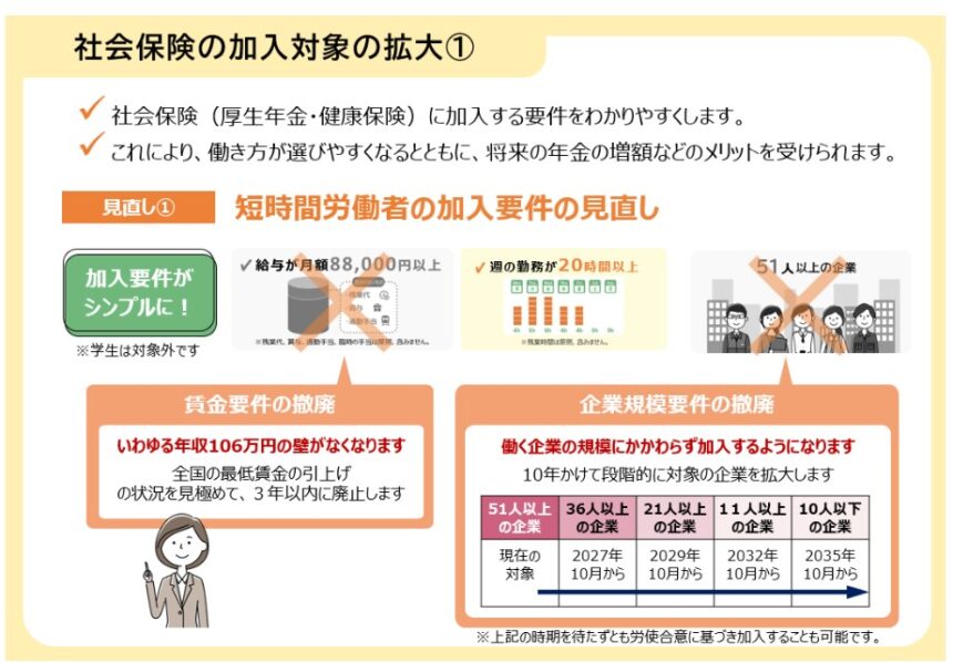 短時間労働者や中小企業の従業員が、厚生年金や健康保険に加入しやすくなります。