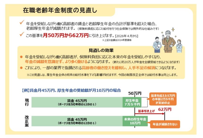 働きながら年金を受け取る高齢者に対する年金減額基準が緩和されます。
